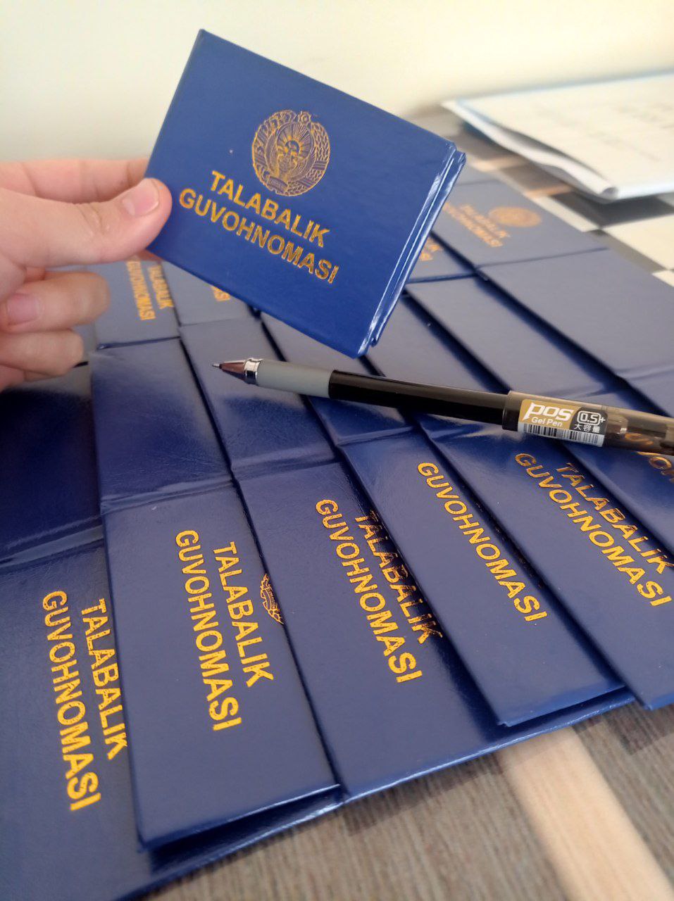 Buning rangi koʻk shakli esa eni uzun boʻyi esa qisqa boʻladi. Ustida Respublikamizning gerbi va TALABALIK GUVOHNOMASI degan soʻzlar boʻladi