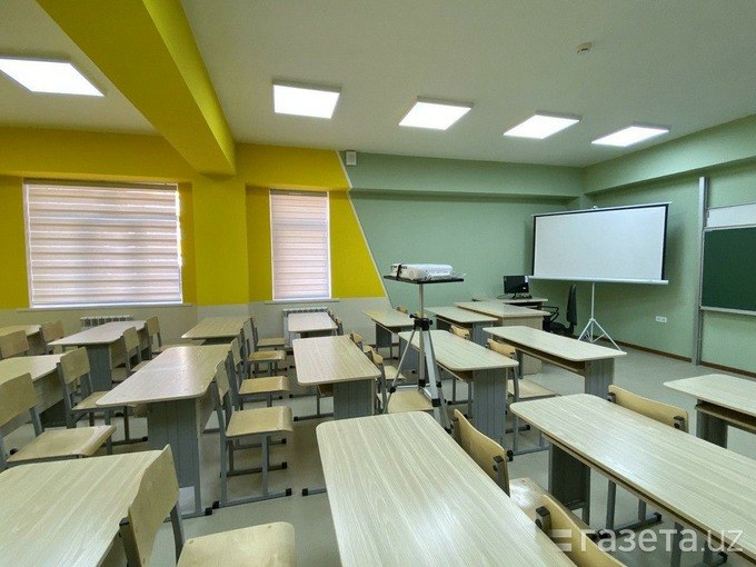 Xona toʻrida esa yashil rangdagi doska va proektor joylashgan.